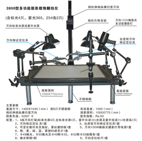 1、4组万向灯架(标准光源4只,紫外光源4只:紫外长波365和短波254光源各2只)