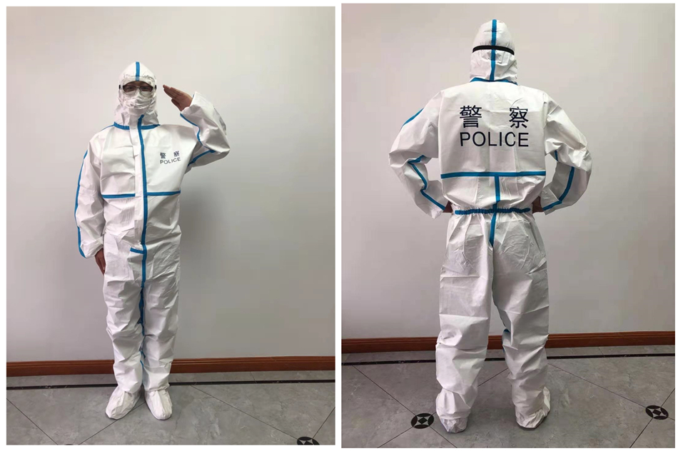 • 产品描述: 新标无纺布带帽连体防护服 警用印字医用防护服