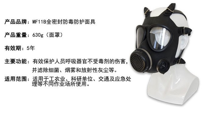 MF11B型防毒面具是一种设计新颖的直接式防毒面具,在化学、生物和放射性污染时,能对人员的呼吸**、眼镜和面部皮肤提供有效防护。可供军队**和民防使用,也可用于工业、农业、仓库和科研等不同领域。