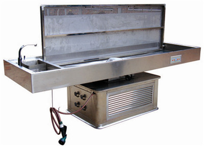 316L优质不锈钢材质:2mm厚,坚固耐用,承载重量:≥150kg。固定式双座结构。台面边框内侧倾斜(模具冲压成型);双排风功能:台面内侧和底座侧面可各自独立排风除臭(需与抽排风系统工程联用),使得实验室排风除臭效果更佳;测量功能;有移动测量定位功能;对角取材功能;解剖器械定位功能;气水分离功能;毛发脂肪等污垢排除装置;台面四角模具成型大弧形圆角,台面四边大弧型边框;模具冲压水池大口径进口落水管、不会堵塞下水道;排风圆孔加长(增加排风面积及效果约1.5倍),台面四内侧四边全部开排风圆孔(增大排风面积和效果),固定脚四周侧面经模具冲压而成的排气栅栏(增加排风面积和效果约1.5倍),洗涤池内设有防尸体组织、毛发进入下水道的隔离围栏,落水孔处设有过滤器。在台面与底部倾斜面之间四周设有稳压喷水带(有效排净污物)。双排水(工作台面设不对称四倾斜浅盆式泄水口及水槽排水口)功能,台面阀控双向喷淋与多水形调节移动水枪,冷热水调温功能(具体调温方法见设备操作说明书,热水源由用户提供)。带洗手池和高位冷热水龙头。台面不锈钢拉姆斯2m标尺(字迹清晰永不磨损);工作台面模压冲压成形,内圆弧连接,不结垢,方便清洗和消毒。毛发脂肪等污垢排除机构技术要求:双落水,可以方便清除淤积的尸体毛发脂肪等,防止堵塞下水道。