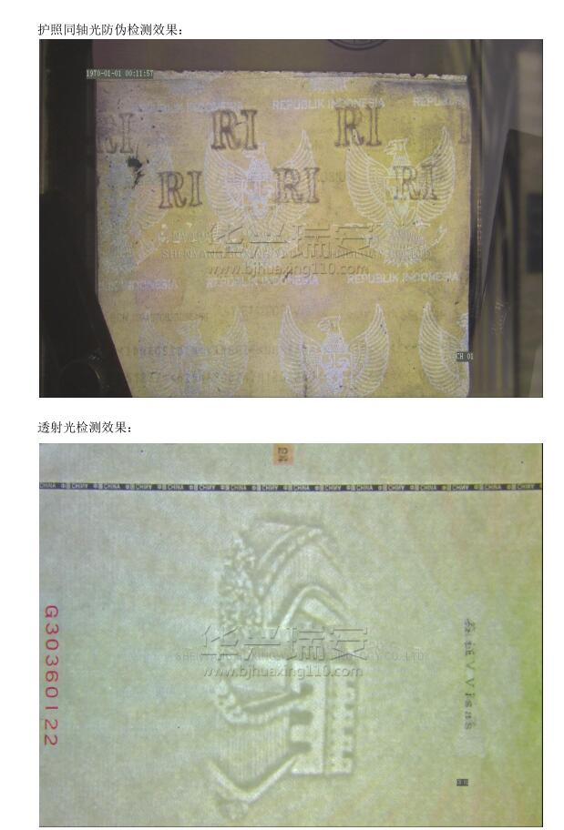 用于采集超高分辨率的护照、身份证、签证或其它文件的图像,通过采集的图像与防伪特征图像数据库自动比较,自动识别整版伪造、揭换照片、更改数据的证件并报警;自动比对机读码信息、资料页信息、芯片信息,信息不一致时自动报警;自动检测校验码和证件有效期,异常情况自动报警;摄像机光学采集的照片和电子护照RFID芯片中读取的电子照片自动并排显示,提供对问题护照进行细节放大观察,多种荧光检验等检测、护照采集等功能。