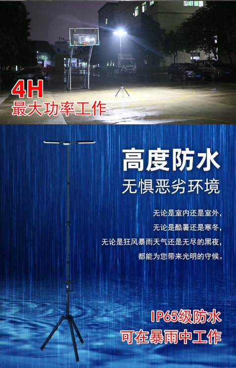 外观:设备采用隐蔽布线设计,看不到裸露电线;主要由灯头、伸缩杆和脚部支架组成,配备提手,方便携带